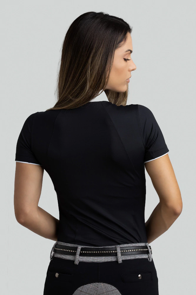 Seu design moderno apresenta um ziper metálico que adiciona um toque contemporâneo, enquanto os detalhes contrastantes sob as mangas reforçam a personalidade elegante e feminina da peça. A modelagem é pensada para valorizar a silhueta, proporcionando um caimento perfeito e refinado. Strass Horsery na gola.